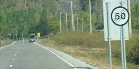 ຂ. ປ້າຍສຸດເຂດຄວາມໄວຈໍາກັດ ຈາກປ້າຍນີ້ ອະນຸຍາດໃຊ້ຄວາມໄວເກີນ 50 ກິໂລແມັດຕໍ່ຊົ່ວໂມງ, ແຕ່ ລົດເບົາ ບໍ່ໃຫ້ເກີນ 100 ກິໂລແມັດຕໍ່ຊົ່ວໂມງ, ລົດບັນທຸກບໍ່ໃຫ້ເກີນ 90 ກິໂລແມັດຕໍ່ຊົ່ວໂມງ