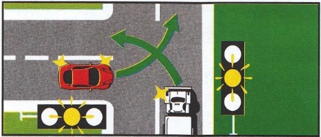 ຄ. ຜູ້ຂັບຂີ່ທີ່ຈະຜ່ານທາງແຍກ ທີ່ມີໄຟສັນຍານຄວບຄຸມ ເປັນສີແດງ ຕ້ອງຢຸດລົດຢູ່ຫຼັງເສັ້ນຢຸດ, ຖ້າບໍ່ມີເສັ້ນຢຸດໃຫ້ຢຸດກ່ອນຮອດແລວຂອບທາງທີ່ຕັດກັບທິດທາງໜ້າຂອງຕົນປະມານ 1.5 ແມັດ, ມີໄຟສັນຍານຈະລາຈອນຢູ່ ທີ່ບໍ່ແມ່ນທາງແຍກຕ້ອງຢຸດຢູ່ຫຼັງໄຟສັນຍານ