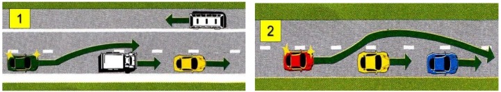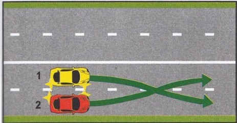 ຂ. ລົດເກັງສີແດງເລກ 2 ຈະປ່ຽນໄປຊ່ອງຈະລາຈອນກໍ້າຊ້າຍຕ້ອງເປີດໄຟສັນຍານລ້ຽວຊ້າຍ ແລະ ປ່ອຍໃຫ້ລົດເກັງສີເຫຼືອງໄປກ່ອນ
